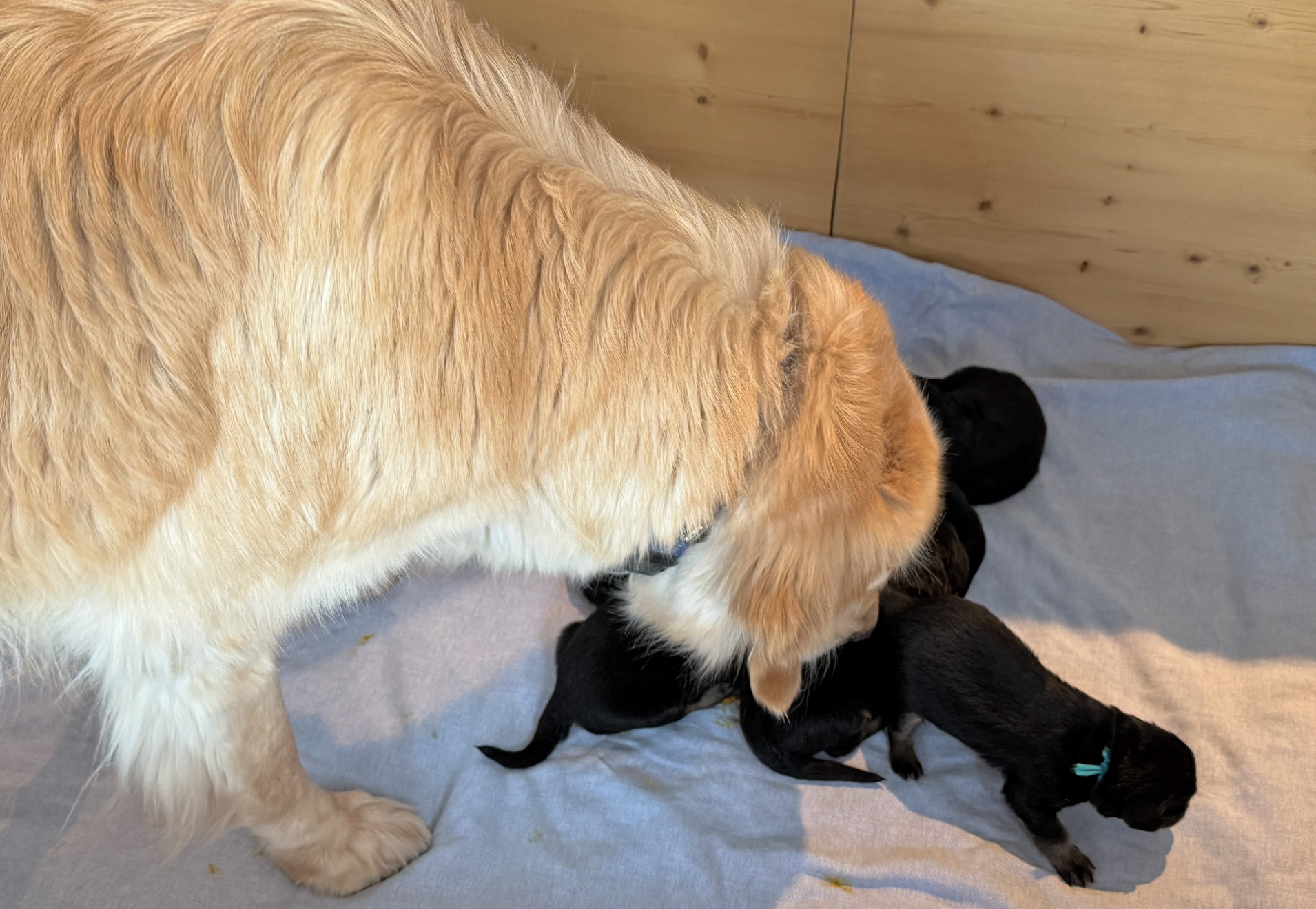 Die Geburt der Welpen hat sie aufmerksam von ihrem Platz aus mitverfolgt und ist die ganze Zeit wach geblieben. Es war wunderschön zu beobachten, wie interessiert, fürsorglich und präsent sie dabei war.